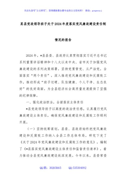 / 某县党政领导班子关于2024年度落实党风廉政建设责任制情况的报告
