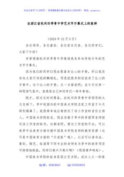 / 在浙江省杭州四季青中学艺术节开幕式上的致辞
