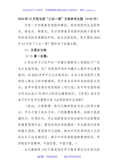 / 2024年12月党支部“三会一课”方案参考主题(4142字)