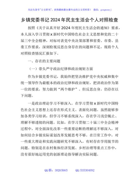 乡镇书记2024年民主生活会对照检查4600字