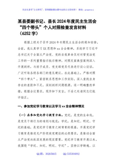 / 某县委副书记、县长2024年度民主生活会“四个带头”个人对照检查发言材料(6252字)