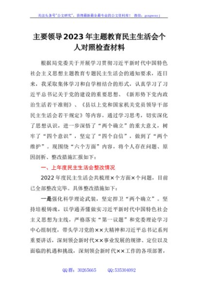 / 局党委主要领导2023年主题教育民主生活会个人对照检查材料