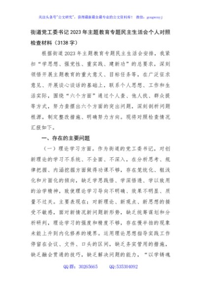 / 街道党工委书记2023年主题教育专题民主生活会个人对照检查材料
