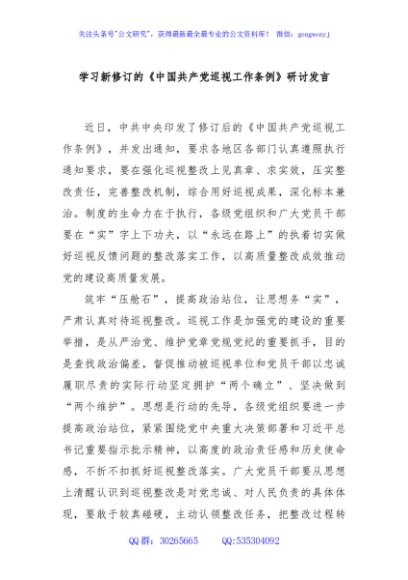 / 学习新修订的《中国共产党巡视工作条例》研讨发言