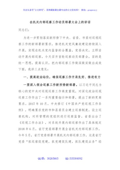 / 在机关内部巡察工作动员部署大会上的讲话