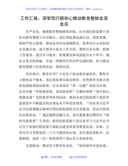 工作汇报:深学笃行砺初心推动教育整顿走深走实