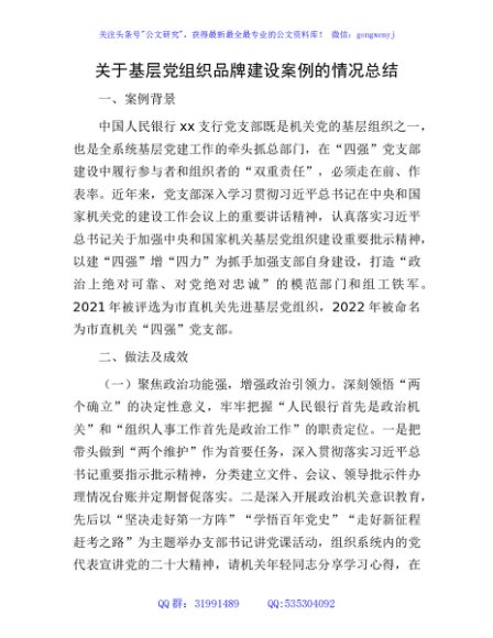 / 国企银行党组织品牌建设案例情况总结(四强党支部)