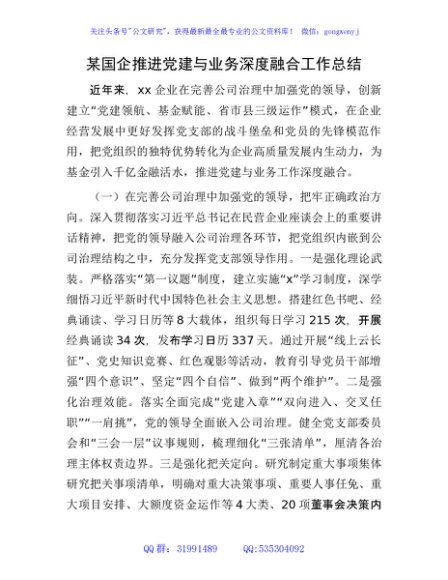/ 国企公司推进党建与业务深度融合工作总结