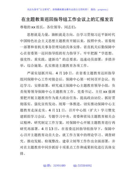 / 在主题教育巡回指导组工作会议上的汇报发言