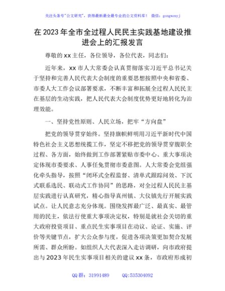 / 在2023年全市全过程人民民主实践基地建设推进会上的汇报发言