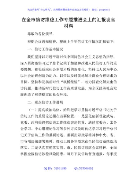 / 在全市信访维稳工作专题推进会上的汇报发言