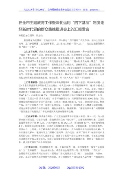 / 在全市主题教育工作暨深化运用“四下基层”制度走好新时代党的群众路线推进会上的汇报发言
