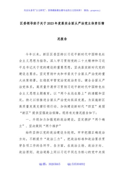 / 区委领导班子关于2023年度落实全面从严治党主体责任情况报告