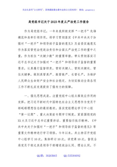 / 局党组书记关于2023年度从严治党工作报告