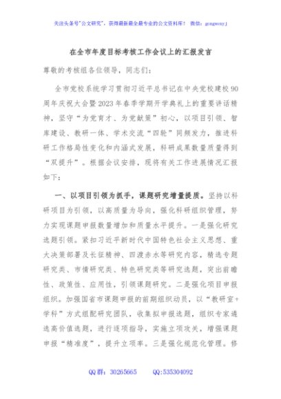 / 在全市年度目标考核工作会议上的汇报发言