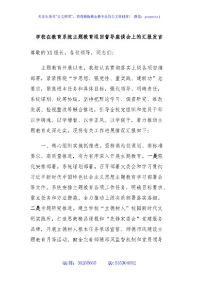 / 学校在教育系统主题教育巡回督导座谈会上的汇报发言