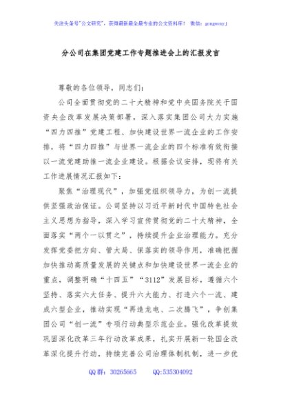 / 分公司在集团党建工作专题推进会上的汇报发言