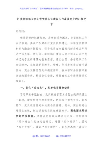 / 区委组织部长在全市党员队伍建设工作座谈会上的汇报发言