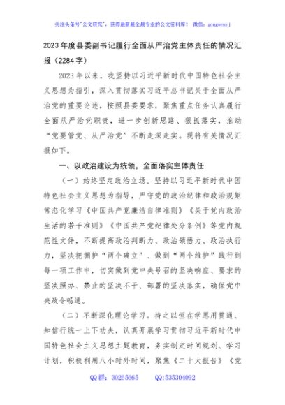 / 2023年度县委副书记履行全面从严治党主体责任的情况汇报