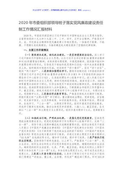 / 2020年市委组织部领导班子落实党风廉政建设责任制工作情况汇报材料