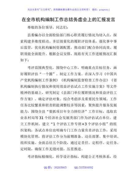 / 在全市机构编制工作总结务虚会上的汇报发言