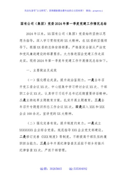 / 国有公司(集团)党委2024年第一季度党建工作情况总结
