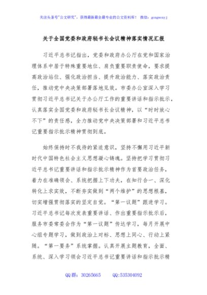 / 关于全国党委和政府秘书长会议精神落实情况汇报