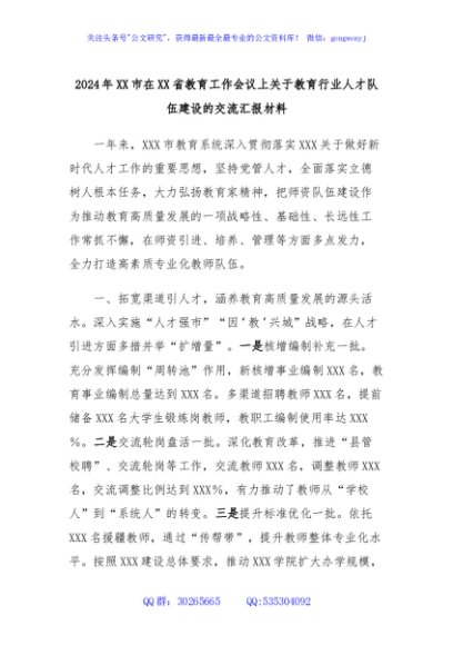 / 2024年XX市在XX省教育工作会议上关于教育行业人才队伍建设的交流汇报材料