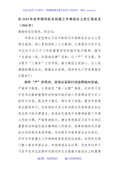 / 在2024年全市模范机关创建汇报发言(市委办