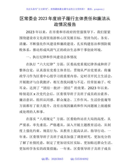县区班子履行主体责任和廉洁从政情况报告