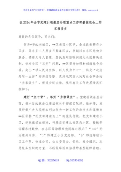 / 在2024年全市党建引领基层治理重点工作部署推进会上的汇报发言