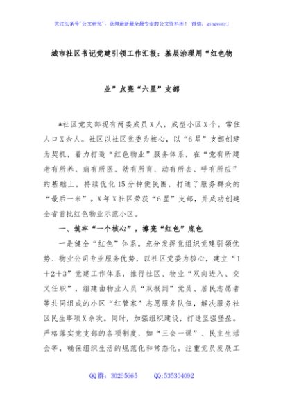 / 城市社区书记党建引领工作汇报:基层治理用“红色物业”点亮“六星”支部