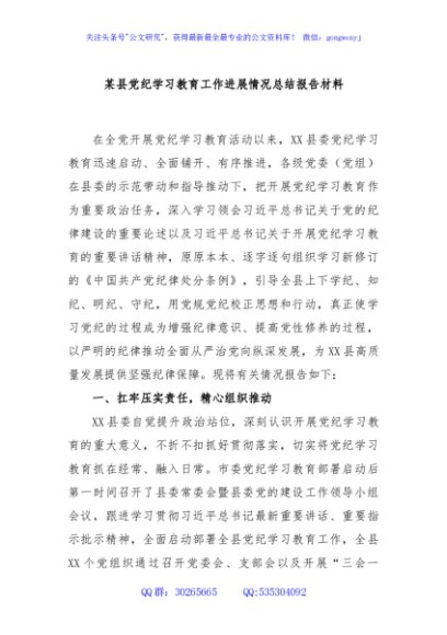 / 某县党纪学习教育工作进展情况总结报告材料