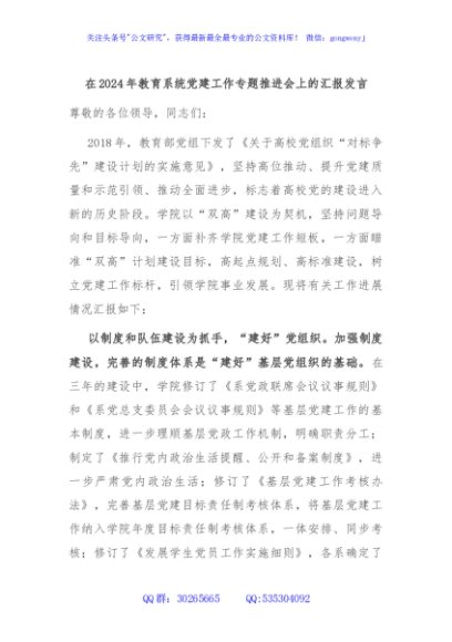 / 在2024年教育系统党建工作专题推进会上的汇报发言