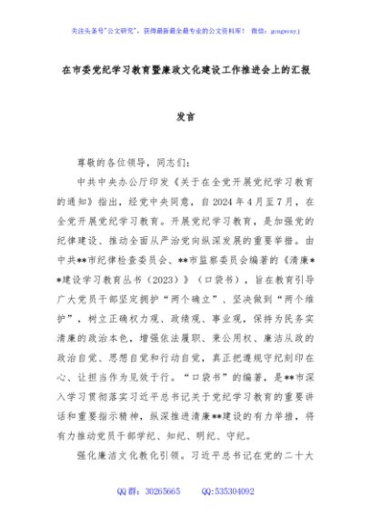 / 在市委党纪学习教育暨廉政文化建设工作推进会上的汇报发言