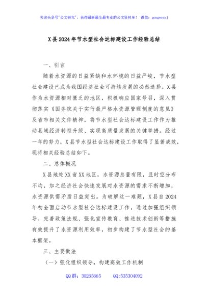 / X县2024年节水型社会达标建设工作经验总结