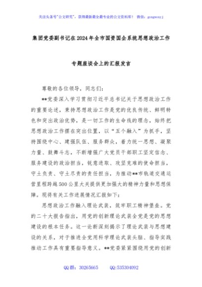 / 集团党委副书记在2024年全市国资国企系统思想政治工作专题座谈会上的汇报发言