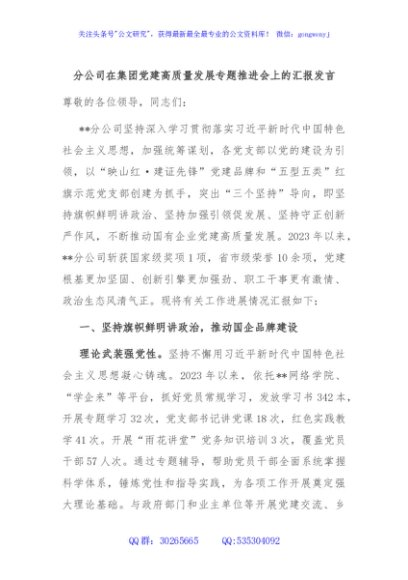 / 分公司在集团党建高质量发展专题推进会上的汇报发言