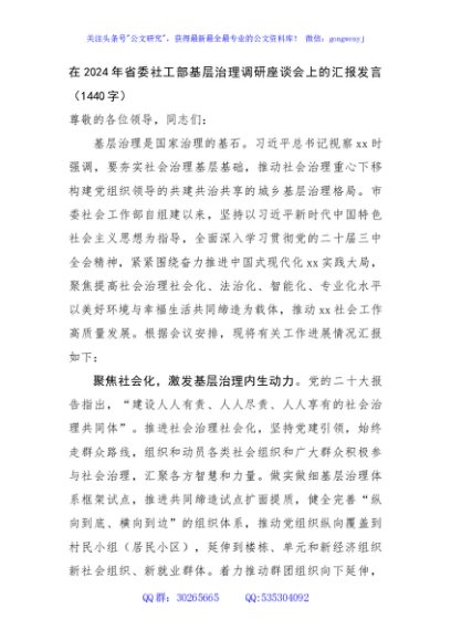 / 在2024年省委社工部基层治理调研座谈会上的汇报发言(1440字)