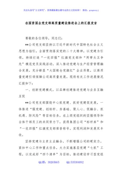 / 在国资国企党支部高质量建设推进会上的汇报发言