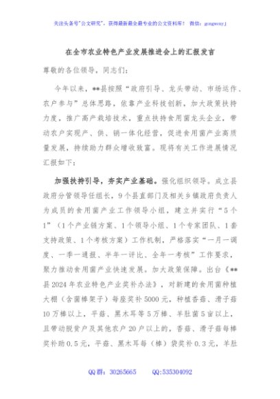 / 在全市农业特色产业发展推进会上的汇报发言
