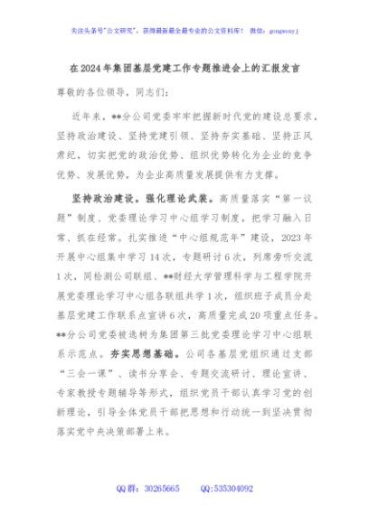 / 在2024年集团基层党建工作专题推进会上的汇报发言