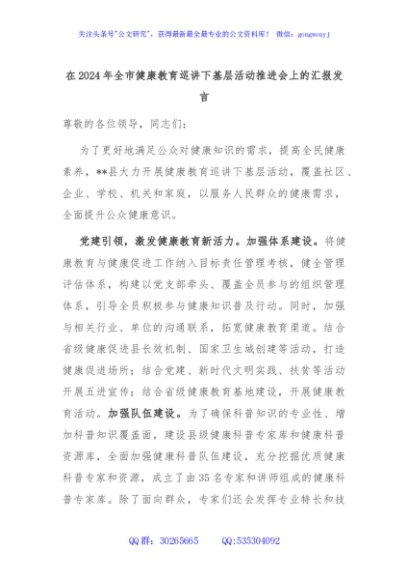 / 在2024年全市健康教育巡讲下基层活动推进会上的汇报发言