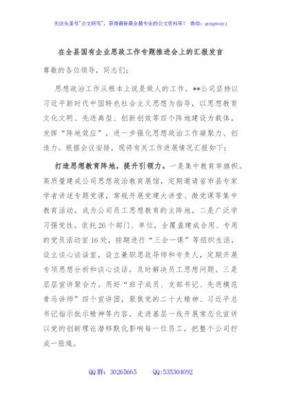 / 在全县国有企业思政工作专题推进会上的汇报发言