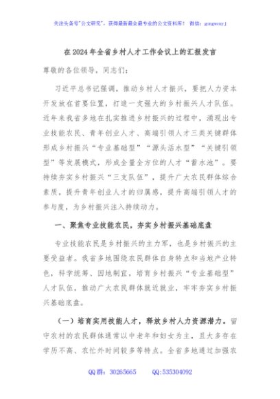 / 在2024年全省乡村人才工作会议上的汇报发言
