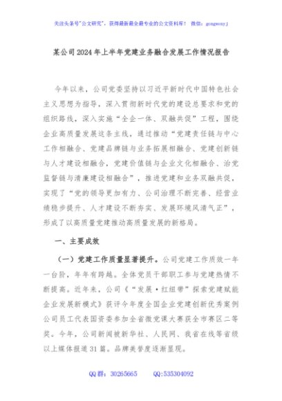 / 某公司2024年上半年党建业务融合发展工作情况报告