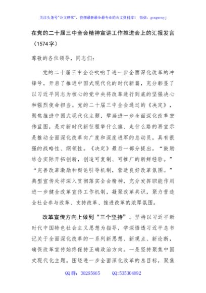 / 在党的二十届三中全会精神宣讲工作推进会上的汇报发言(1574字)