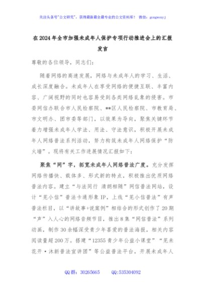 / 在2024年全市加强未成年人保护专项行动推进会上的汇报发言