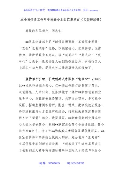 / 在全市侨务工作年中推进会上的汇报发言(区委统战部)