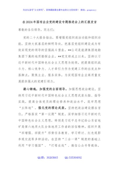 / 在2024年国有企业党的建设专题推进会上的汇报发言